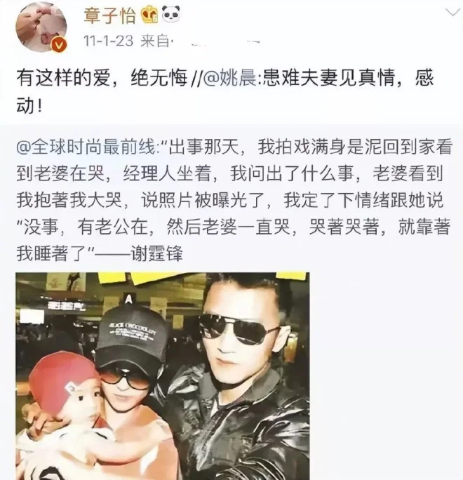 不仅如此,在姚晨转发媒体感叹谢霆锋与张柏芝感情的文案后,章子怡也同样秒跟。