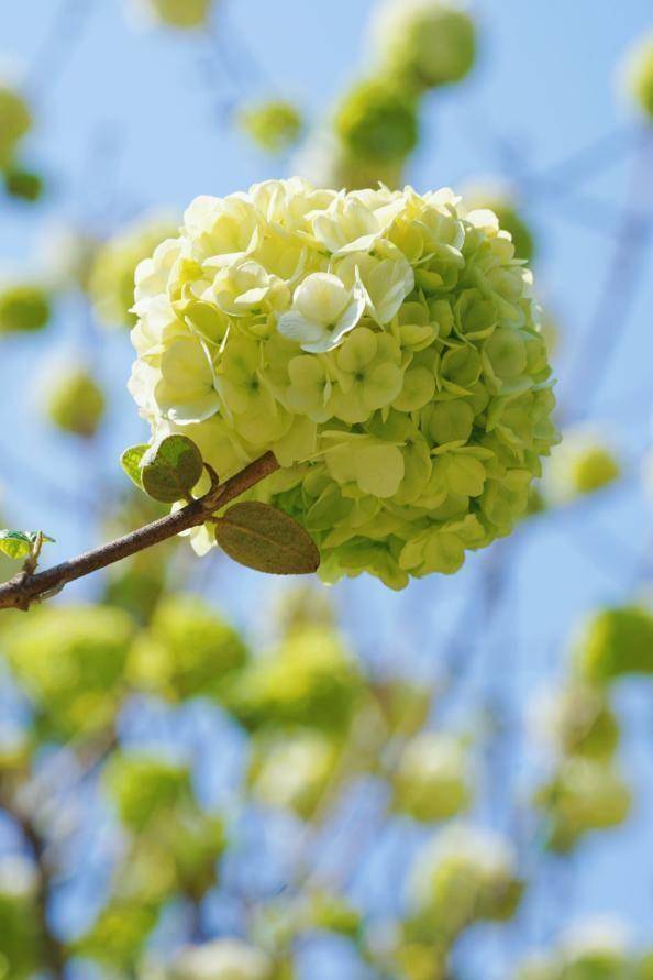 抬头望去,蓝天之下,一簇簇绣球像悬浮在半空的翠玉,带着微微透明的质地,在风中轻轻摇曳。