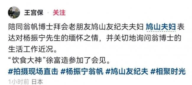 鸠山由纪夫夫妇首先表达了对杨振宁先生的深切缅怀,还仔细询问了翁帆的生活和工作近况。