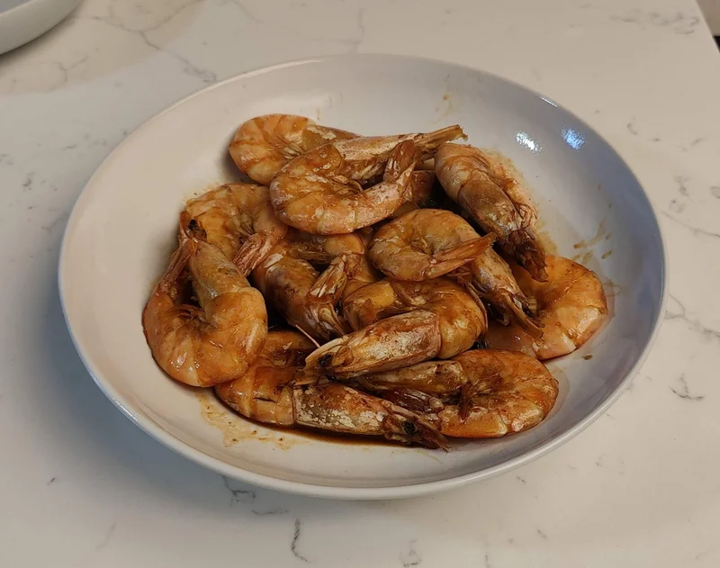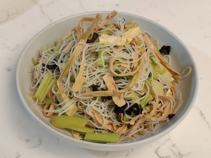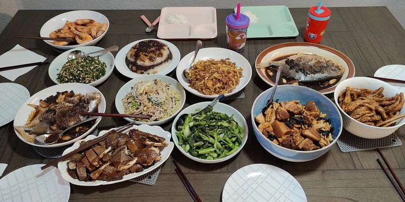 茼蒿拌豆腐干、芹菜黑木耳笋干丝蛋皮粉丝、蚝油芥蓝、杭州卤鸭、红烧金鲳鱼(2条)、油爆大海虾、冬笋韭黄(杭州叫韭芽)炒肉丝、黑木耳腐竹红烧肉、卤鸡爪、八宝饭: