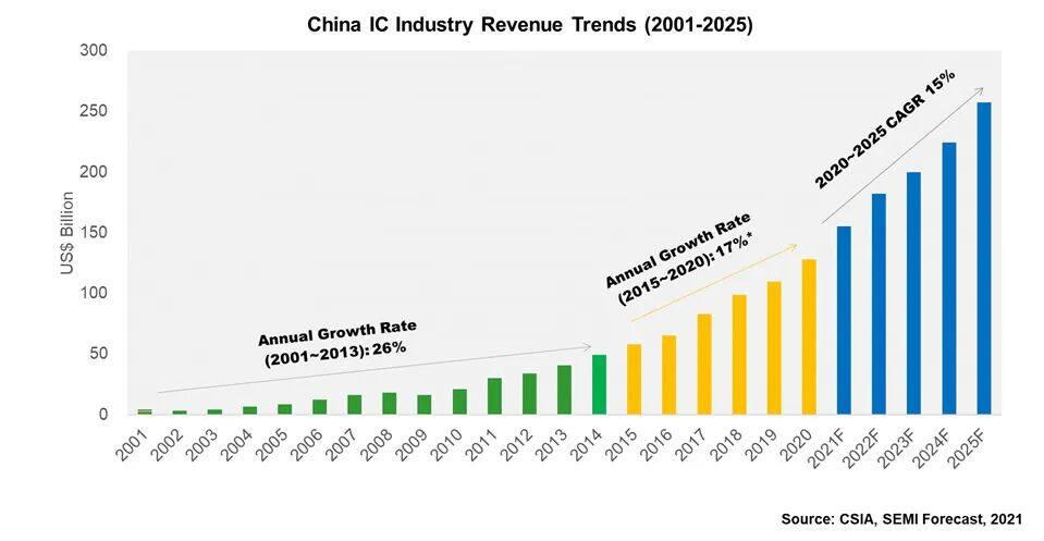 按照这个斜率推演,研究机构Omdia预测今年中国半导体市场规模将增长31.3%至5465亿美元,绝非虚言。
