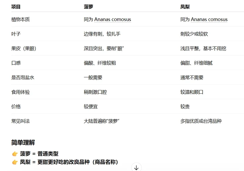 小时候,眼界有限,心里只认菠萝却不知凤梨,改革开放后,大陆引进无眼、甜脆的改良凤梨品种(如金钻、牛奶凤梨),口感大幅提升。台湾凤梨通过贸易进入大陆市场,因品质佳、口感好,成为热门水果。广东徐闻、海南等地成为 “中国菠萝之乡”,规模化种植,凤梨(菠萝)成为大众日常水果。(摘自ChatGPT)好久以前记得在美国超市买的凤梨产地哥斯达黎加或波多黎各,傻大姐我手捧着凤梨口叫菠萝,反正就是Pineapple,还时不时用它来做点心和入菜。后来从网上学会了区分,一时手痒把菠萝和凤梨图拼起来,以便大家分辨。又从ChatGPT找出对比表格,有图有文,大家更容易明白了。可能会有些人认为两者一样,没必要乔情,非要分个清楚,也对,分不分由您。在这里给大家分享一下,混个贴子罢了。