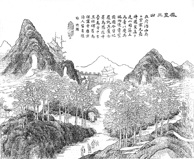 凤凰三山:城西南花露岗凤凰台遗址上远眺江边的三山,李白诗“三山半落青天外”