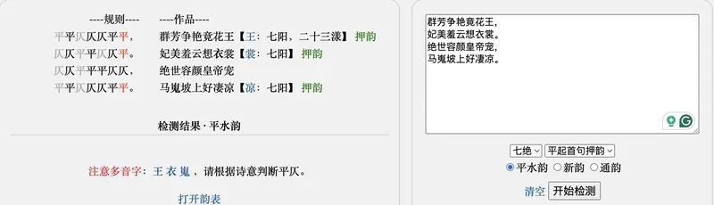 “衣”字出律。哈哈,可见有时候目测比电脑要准哪。为了好理解并方便记忆,再在古诗词里找两个著名的例子: