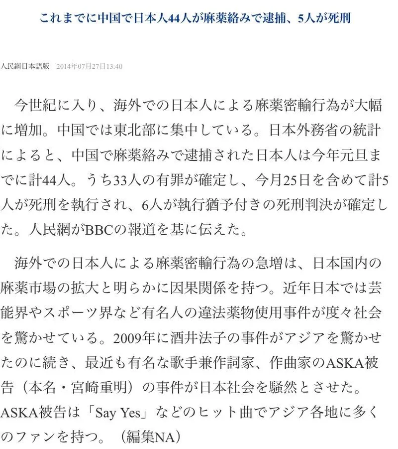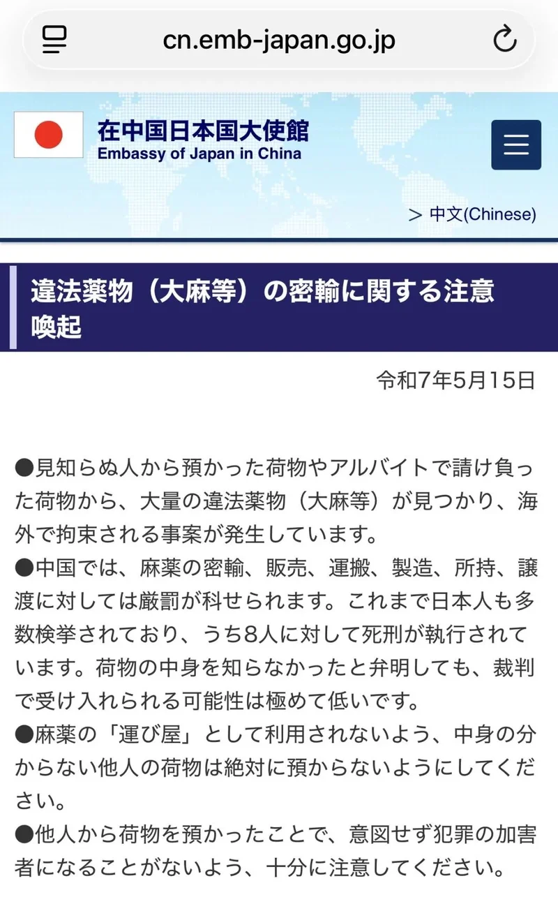 日本驻华大使馆曾发布公告,提醒日本公民切勿在中国境内涉毒、运毒,并透露了此前曾有8名日本人因涉毒而在中国被执行死刑。