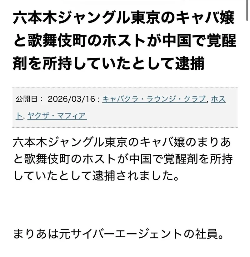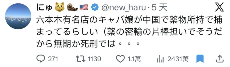 “六本木著名陪酒女因在中国涉毒被捕。她很有可能参与了走私毒品,或将面临无期徒刑、甚至死刑”。