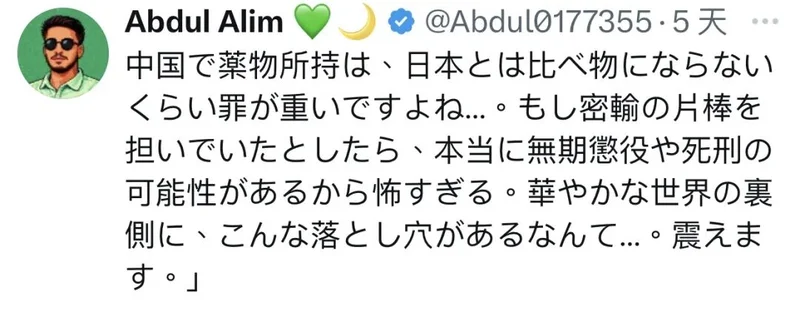“中国对于持有毒品的刑罚位居世界前列的。如果她真的因为涉毒而被捕,那真的是犯下弥天大罪了。”