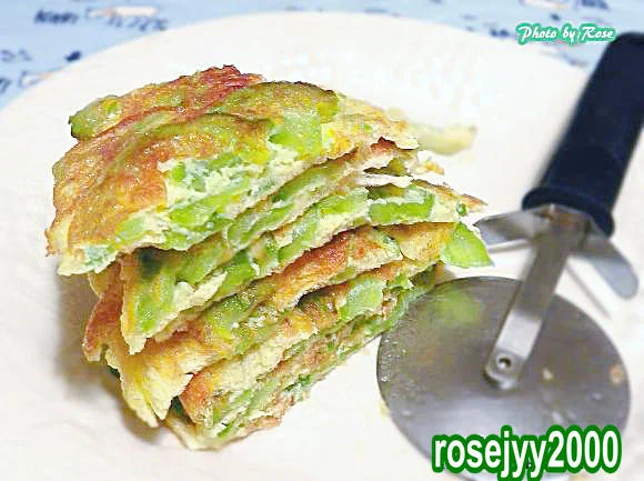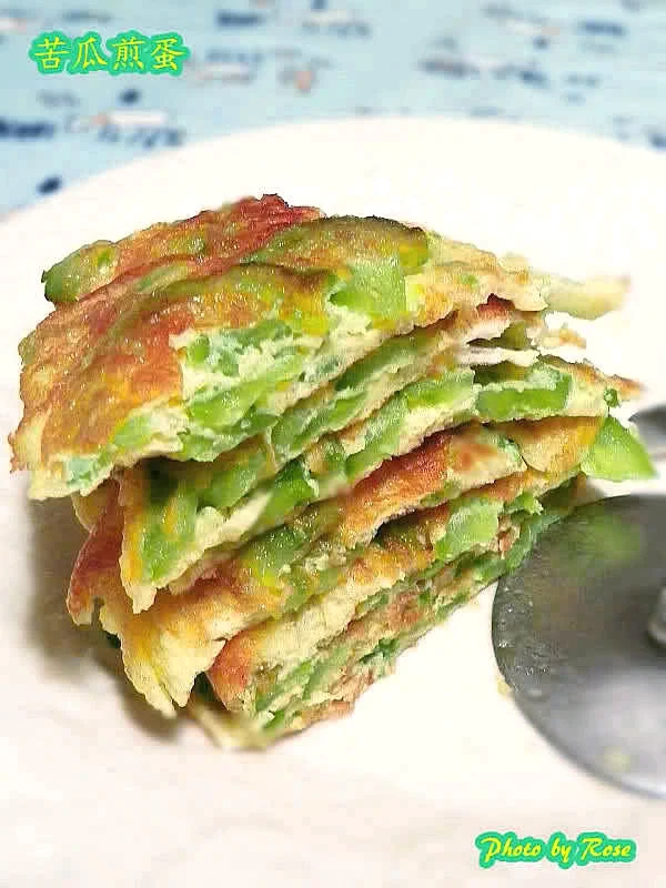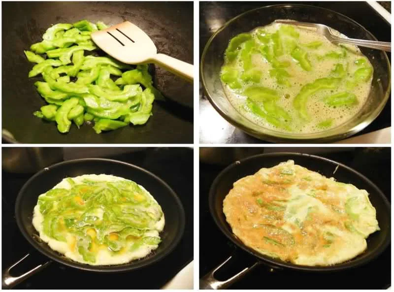 三、平底锅置炉上,中大火,锅热后放菜油2大勺,用铲子把油扩散润锅底,倒入混入了苦瓜的蛋液,顺手用锅铲将苦瓜均匀的铺好,底煎成金黄色;