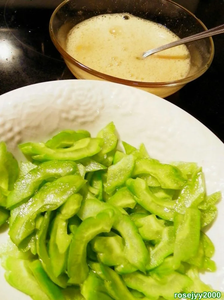 二、炒过的苦瓜放在蛋液里,搅拌均匀;