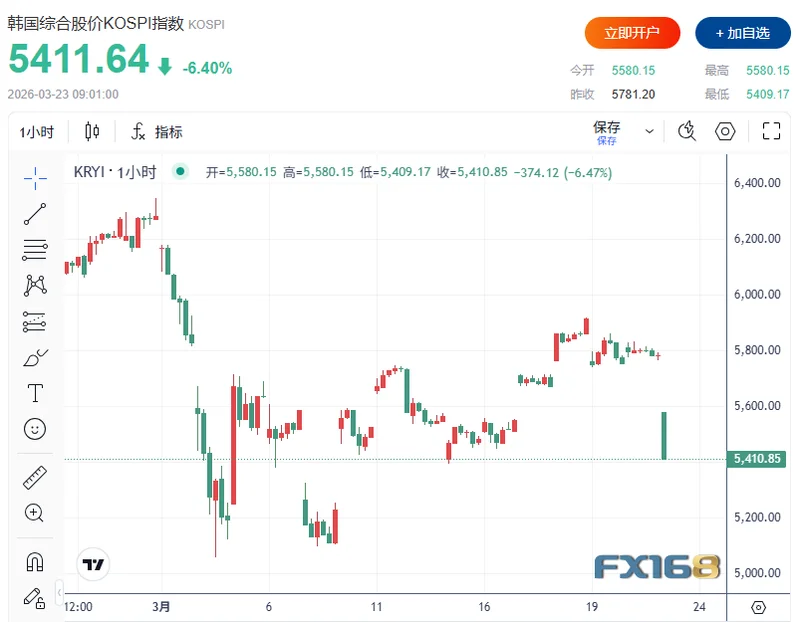 截至撰稿,Kospi指数报5411.64点,较前一交易日下跌超374点,跌幅达6.40%。该指数开盘即报5580.15点,较前一交易日低开201.05点,跌幅为3.48%,显示市场一开盘便笼罩在浓厚的避险情绪之中。