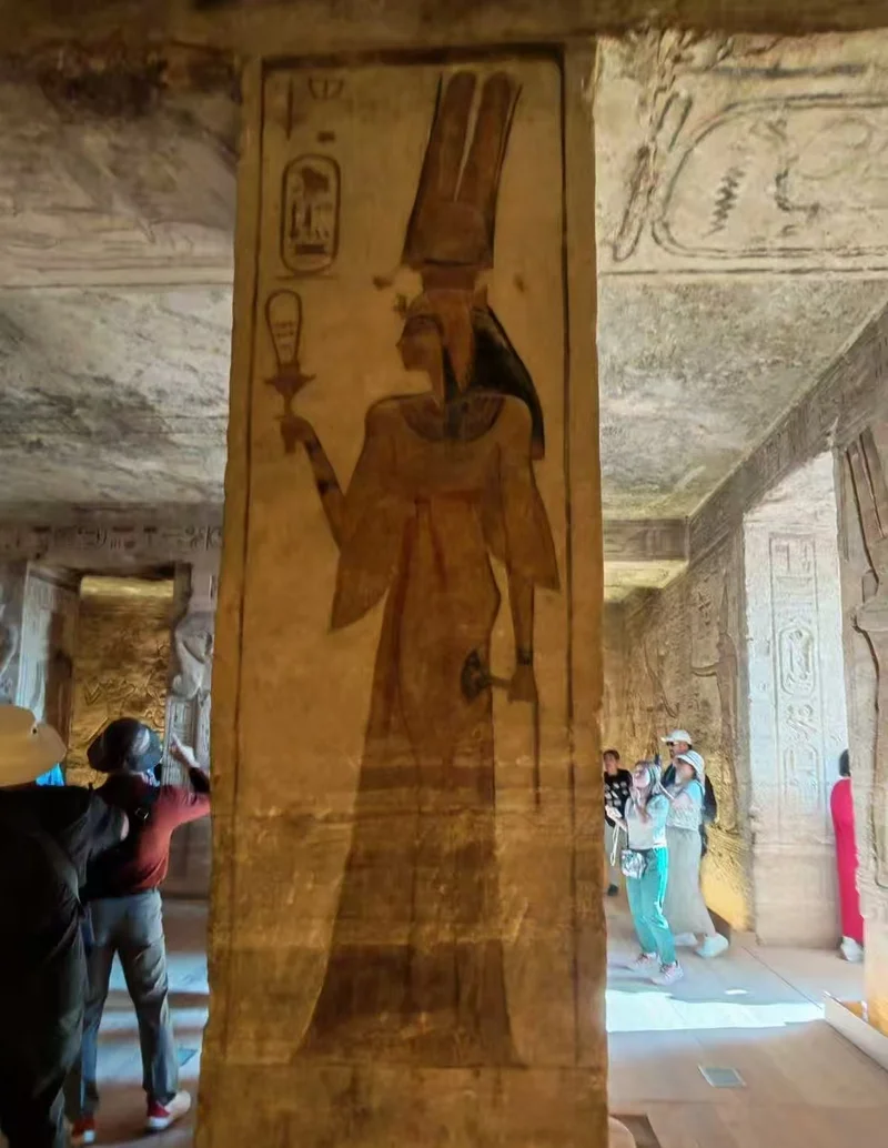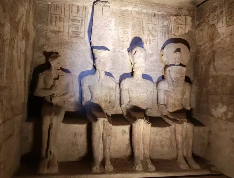 阿布辛贝神庙的太阳节奇观,是古埃及建筑与天文智慧的巅峰:每年2月22日、10月22日清晨,阳光会精准穿透60余米深的神庙,照亮圣坛三尊神像,唯独冥界之神永远隐于黑暗。奇观过程(约6:00–6:20) 晨光入殿。阳光依次照亮三尊神像(从右至左): 拉·霍拉克提、鹰首太阳神、拉美西斯二世。最左侧的普塔——冥界与黑暗之神,永远不被照亮。