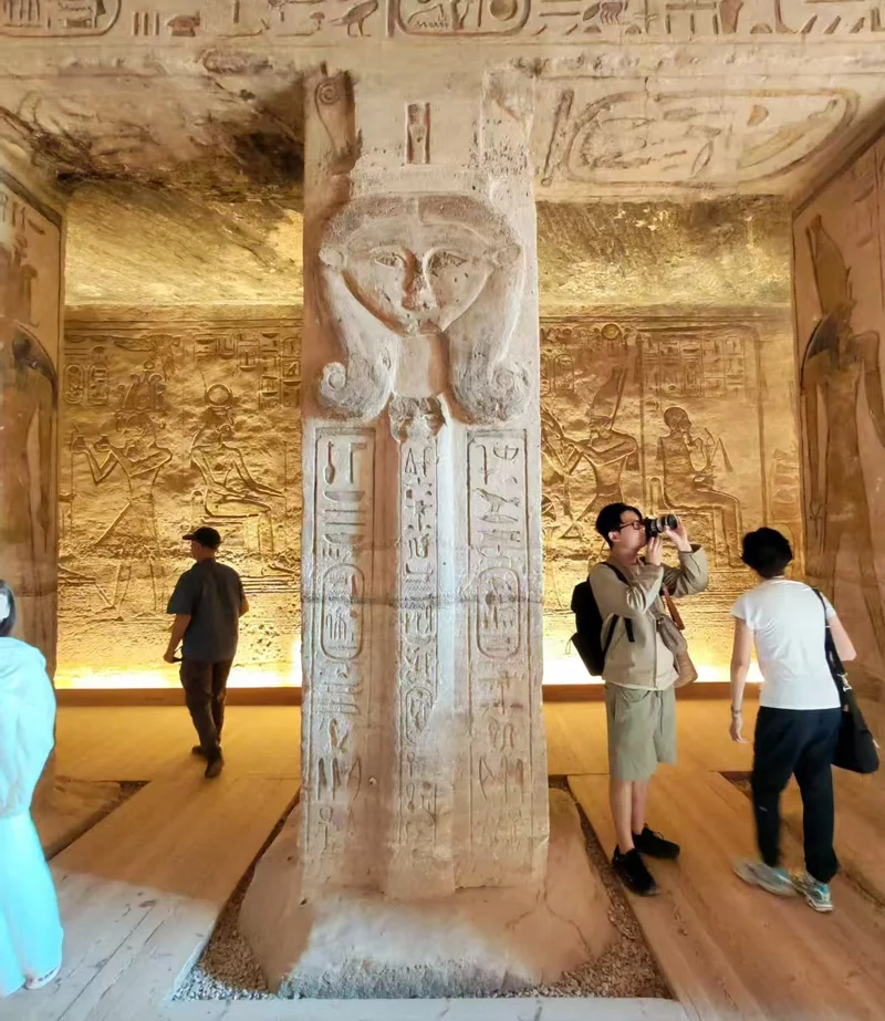 这次的迁移过程堪称是人类文明保护史上的奇迹。迁移工程始于1964年止于1968年,采用了瑞典工程咨询公司设计的方案,核心是将神庙“化整为零”再“复原重生”。工程师们先在原址修建围堰挡住湖水,随后小心翼翼地将整座神庙切割成数千块,其中最大的石块重达30吨,每一块都做好精准编号,再转运至比原址高出60余米、后移约200米的新崖壁处。为还原神庙原貌,新址专门修建了加固混凝土拱顶结构,模拟原有悬崖环境,同时精准测算方位,力求保留神庙的每一处细节,尤其是大神庙著名的太阳节奇观——每年晨光穿透甬道照亮圣坛神像的景象,虽因迁移产生一天误差,却依旧得以延续。