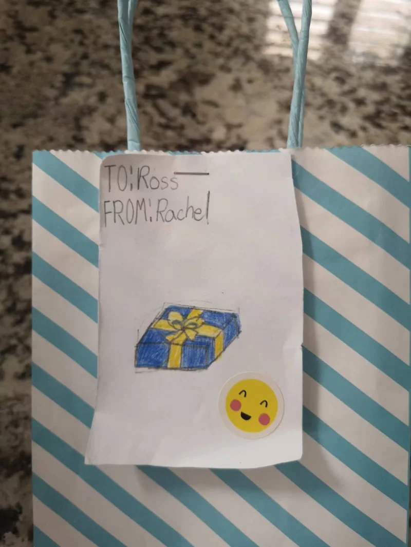(二)后来,Ross长大了,上了小学,情人节拿回一个小礼物,我一看啼笑皆非,赶紧拍照发了个圈儿,结果朋友们都沸腾了,纷纷感慨:这才叫当理想照进现实!