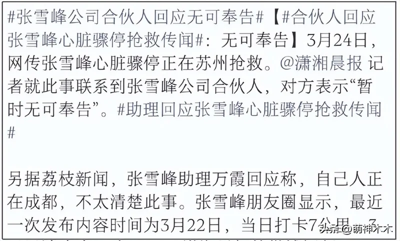 消息出来后,有媒体致电了助理和合伙人。张雪峰助理仅表示人在成都,不太清楚此事;张雪峰合伙人则表示“暂时无可奉告”。而且,记者致电张雪峰本人,电话无人接听,情况看起来并不乐观。