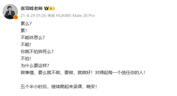 2021年,张雪峰说:累么?累!不能休息么?不能!你就不怕猝死么?不怕!为什么要这样?做事情,要么就不做,要做,就做好!对得起每一个信任你的人!五个半小时后,继续爬起来录课,晚安!