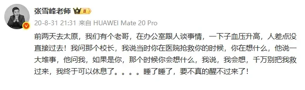 2020年,张雪峰说:前两天去太原,我们有个老哥,在办公室跟人谈事情,一下子血压升高,人差点没直接过去!我问那个校长,我说当时你在医院抢救你的时候,你在想什么,他说一大堆事,他问我,如果是你,那个时候你会想什么,我说,我会想,千万别把我救过来,我终于可以休息了。。。。睡了睡了,要不真的醒不过来了!