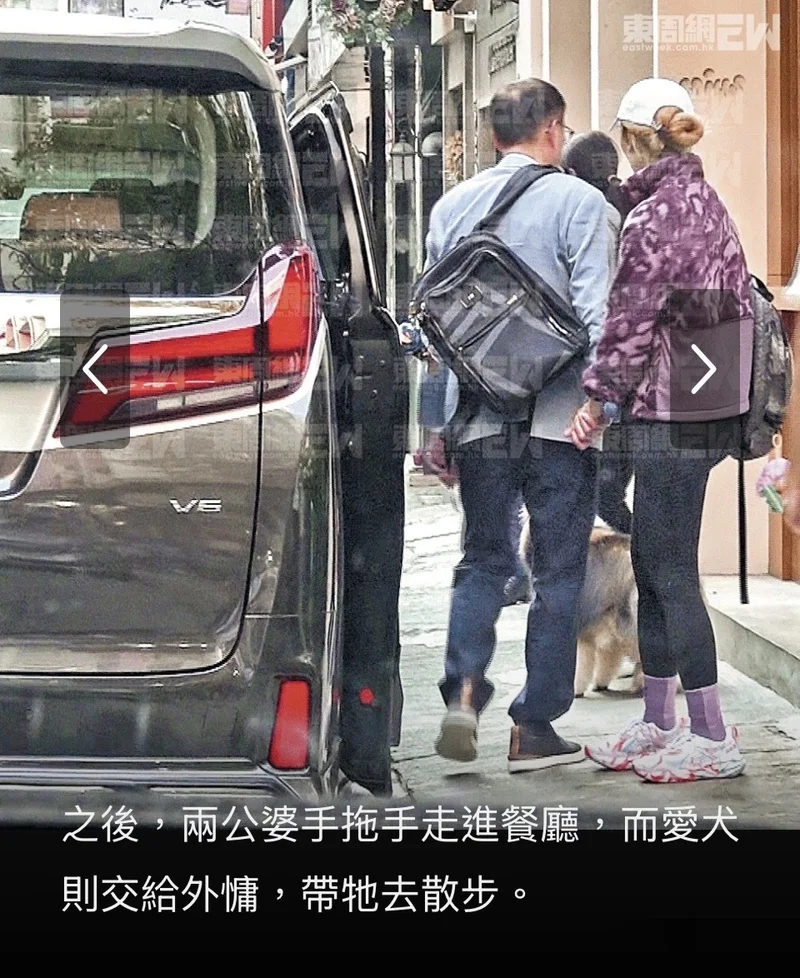 结果餐厅不开门,他便下楼门口等着,过了一会儿,李嘉欣乘坐另一辆7人车过来了。