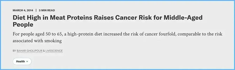 此外,过多摄入蛋白质会增加患癌风险。2014年,《Cell Metabolism》上的一项研究发现,在50至65岁的成年人中,高蛋白质摄入量会升高总体死亡率,并且在随后的18年里,这一年龄段的人死亡风险是低蛋白饮食组的4倍。