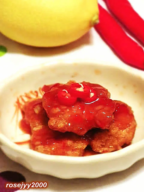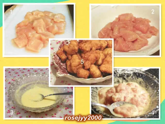 五、开锅,放油,五成热,放沾满蛋浆的鸡块,炸至浅黄色,捞起,再升油温七至八成热,翻炸成较深的金黄色。