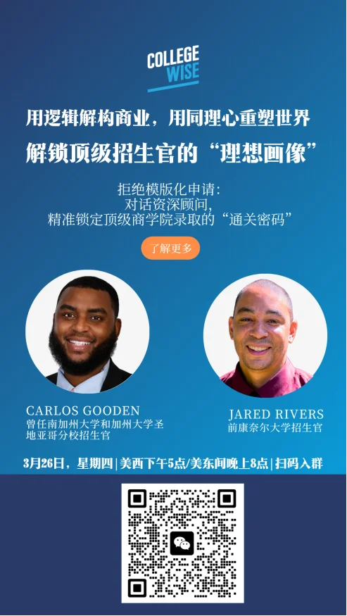 3 月 26 日,CollegeWise 将举办一场面向高中生家庭的专题讲座:《Preparing Your High Schooler for a Business Major: Courses, Activities, and a Smart Timeline》。主讲人 Dr. Carlos Gooden 拥有高等教育博士学位,曾担任USC本科及 MBA 招生主任;Jared Rivers 在大学招生领域积累了 22 年经验,先后服务于康奈尔大学(专职阅读 Applied Economics & Management 方向申请)等。