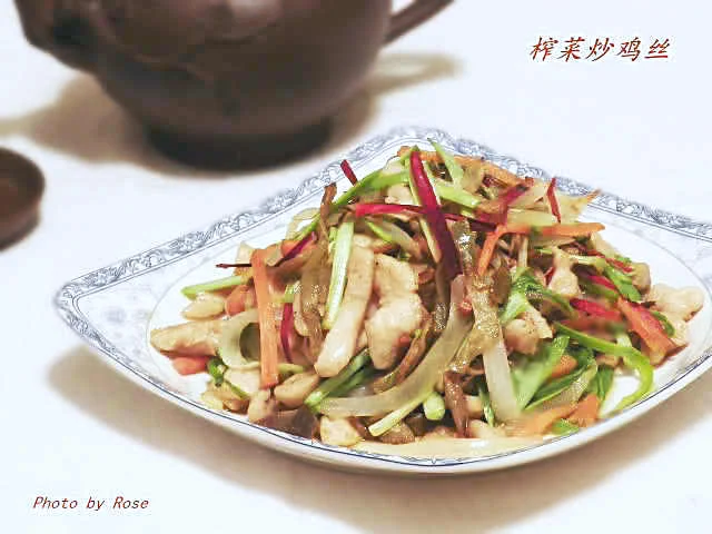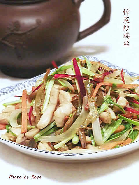 六、倒入鸡丝、红萝卜和蒜苗,加精盐1/4小勺、白糖1/4小勺、胡椒粉1/3小勺,迅速兜均,加麻油1小勺做明油,翻几下,可上锅。注意:榨菜本身有咸味,比炒普通菜少放些盐。