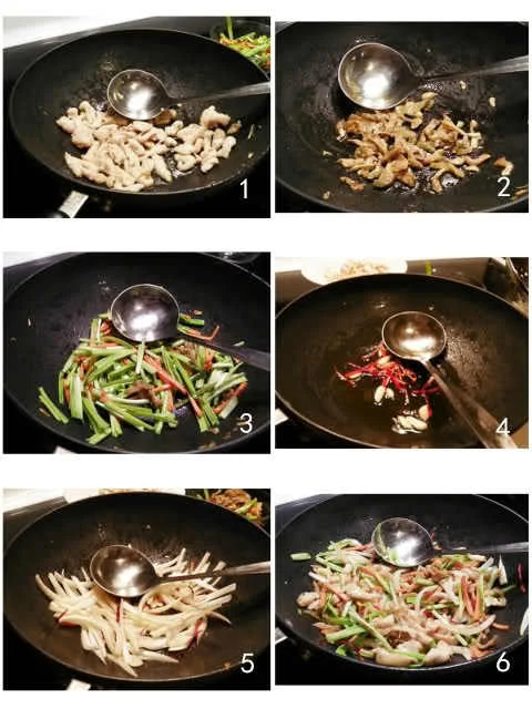 一、起锅,慢火,锅热后放油,立即倒入腌过的鸡肉,稍等片刻,再用锅铲或勺推散,再慢推至肉变成白色,此时肉应该熟,盛起备用。