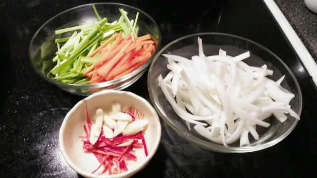 预先将鸡胸肉切成丝,先放生抽1大勺、白糖1/4小勺、胡椒粉1/3小勺,用手抓腌至肉手感有粘性,再放清水2小勺、玉米淀粉1小勺,再用手抓腌,放置约20分钟,另将洋葱、红萝卜切成丝,蒜苗切成段。