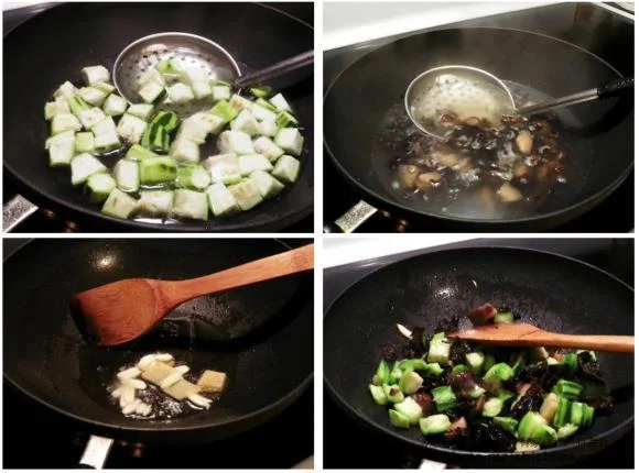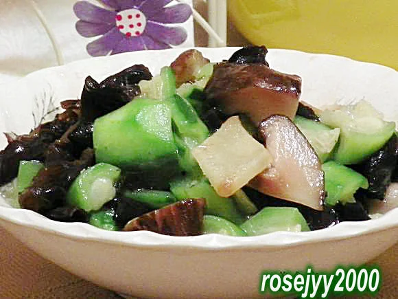 主要材料:丝瓜1条、水发冬菇约5只、水发木耳1把。