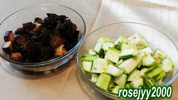 二、冬菇水发后切丁,木耳水发洗净后摘成小朵,然后锅放清水适量、盐巴1/2大勺和菜1大勺油,烧沸后放木耳和冬菇,焯水后捞起沥水;;