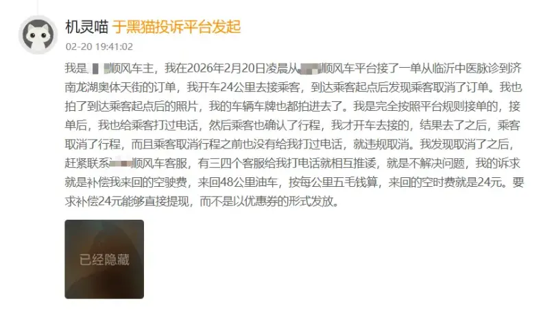 在众多投诉中,无故取消订单导致乘客空等、顺风车车主白跑的情况不在少数。(图/黑猫投诉平台截图)
