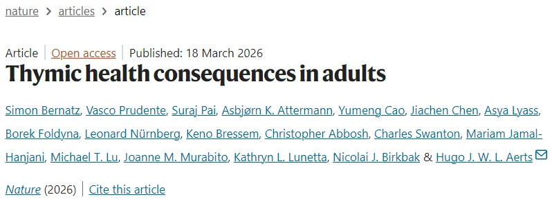 2026年3月18日,来自哈佛大学的研究团队在 Nature 杂志发表题为“Thymic health consequences in adults”的文章。