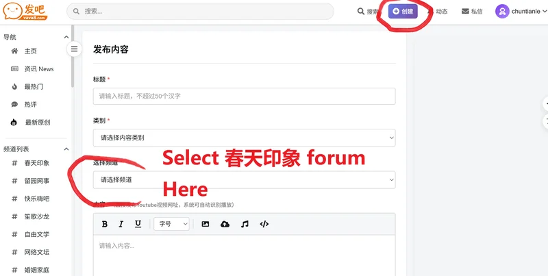 I only show this function to make it simple, so you won’t be confused by other options. Please make sure to post your content in the 春天印象 forum.