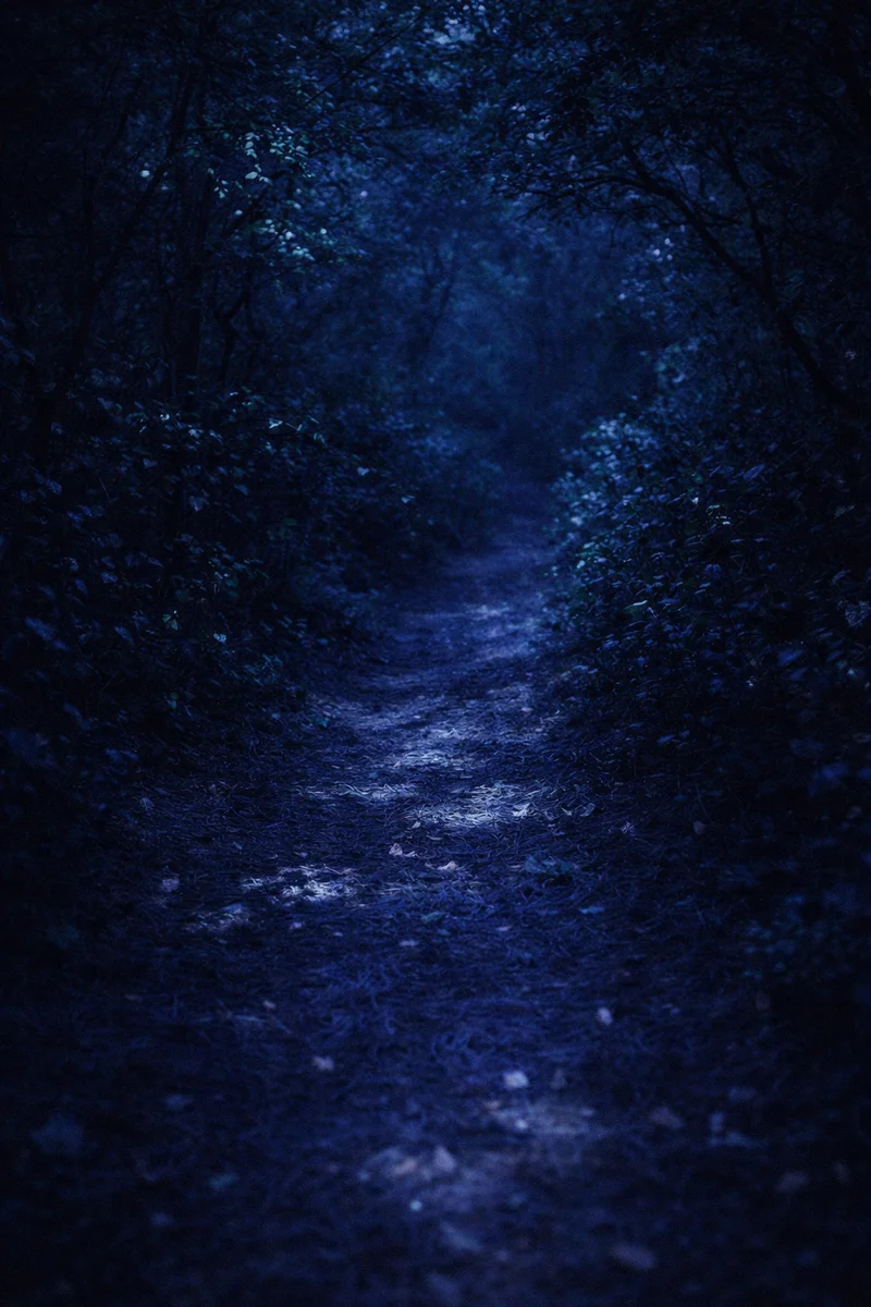 路旁的木桩上,不知被谁刻下一匹蓝色骏马,月光偶尔流连其上,便像要活过来一跃而起,想要跃入行人的梦境。一只夜鸟在马头上振翅起飞,随之传来窜过叶片的窸窣,但很快又归于寂静。路愈发狭窄,渐渐隐入枝叶的环绕。淡淡的月光偶尔从缝隙漏下,投下银色的光斑,像是某种神秘的记号。脚下的松针铺了厚厚一层,踩上去柔软无声,如同看不到头的蓝色地毯,蜿蜒着通往更为幽蓝的空间。