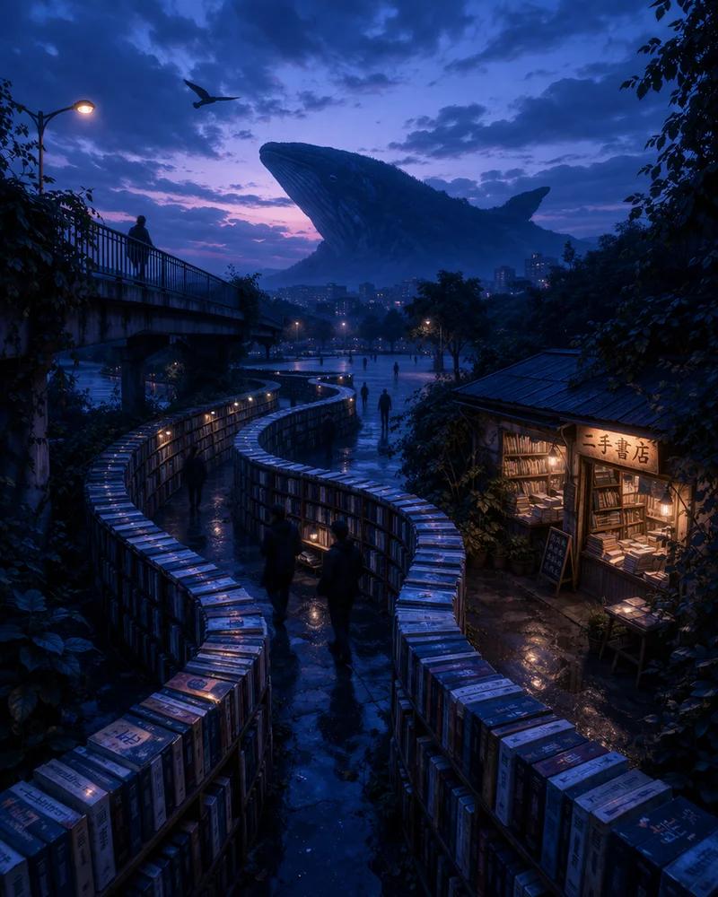 行至书海尽头,只见成群的书脊之上,升起一轮淡淡的月,下方的山峦被蓝色浸染,隐约可见粼粼的仄径,又像鲸鱼的背脊。光芒从捧着书的指缝间漏下,依稀想起了某人写的诗:"把回忆塞进手掌的血管里,灯光透过掌背,仿佛看见鲸鱼跌下云端,掉落在蓝色颜料的池子里。"
