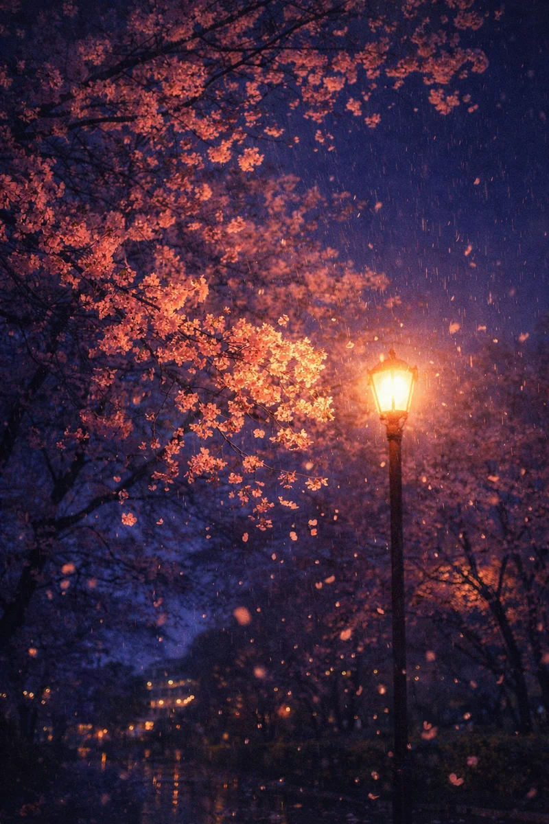 雨势渐缓时,走过剧场后的一排樱花树,抬头可见一簇簇浅红点染在深蓝天幕下,斑驳的光影在树梢轻晃,化作绯色光晕融入夜色。路灯下尤为耀眼的一簇宛如盏盏灯笼,在日夜交替的时刻忽明忽暗。清风徐来,花瓣轻舞飞扬,穿过路灯投下的橙黄光锥,又在落幕的细雨中消散。