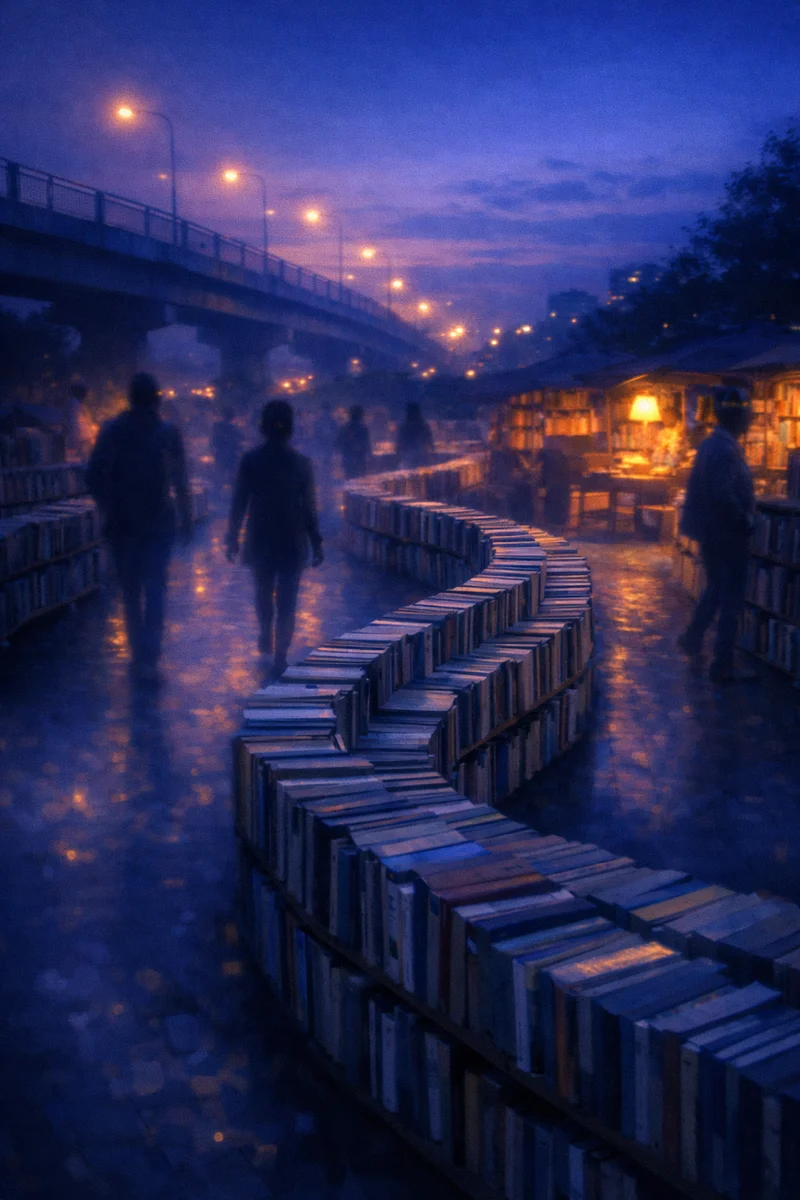 沿着小路来到每日必经的天桥,在暮色下走到对面广场。二手书店将书架排成蜿蜒的曲线,像一条凝固的溪流,静静延伸至广场一角,隔出了一片幽静的狭小天地。行走其间,与迎面而来的人擦身而过,人影在书架间浮动如水,只能依稀辨认其轮廓,彷佛一个个水中倒影。驻足翻看一本画册,灯光透过幽蓝的雾,照亮了书页上的电车,正沿着溪流行驶于纸间,流水似空气一般轻盈,空气又似流水一般湛蓝,溪流的淡影顺着书页蔓延,远处绽放朵朵青莲,似要渗出纸面,在幽蓝天幕下显得愈发静逸。