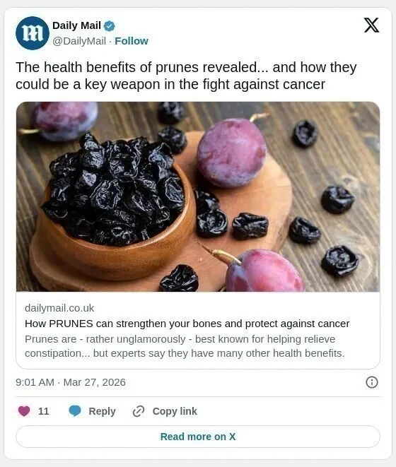 提到西梅干(prunes),很多人第一反应是“通便”。不过,营养专家指出,这种被称为“天然泻药”的干果,其健康价值远不止于此,长期以来被严重低估。