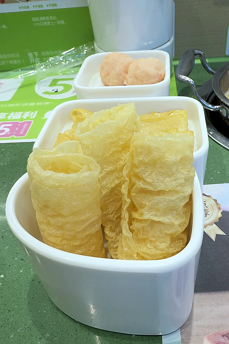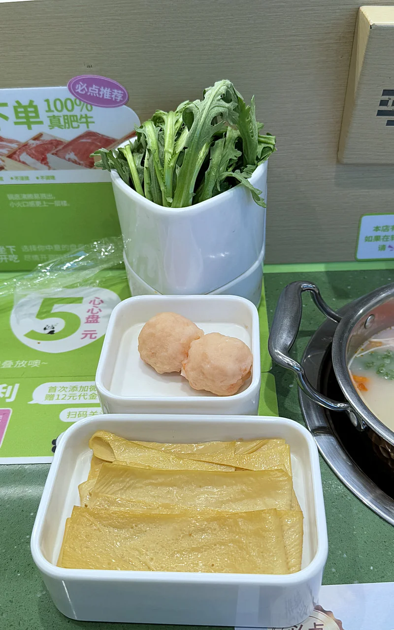 茼蒿、腐皮、虾丸和响铃。