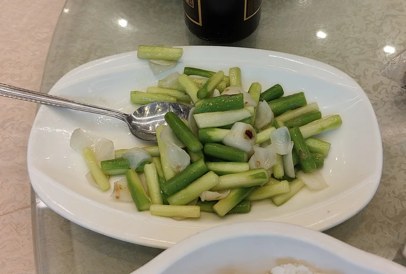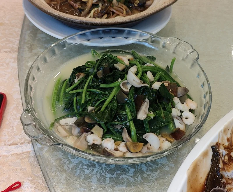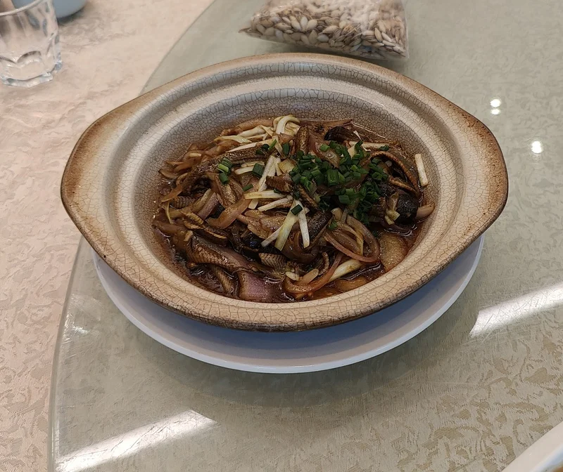 鳝鱼、烂糊肉丝、炒芦笋、上汤菠菜: