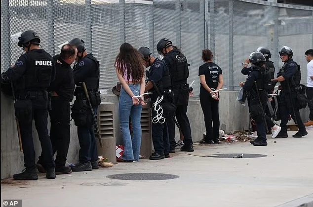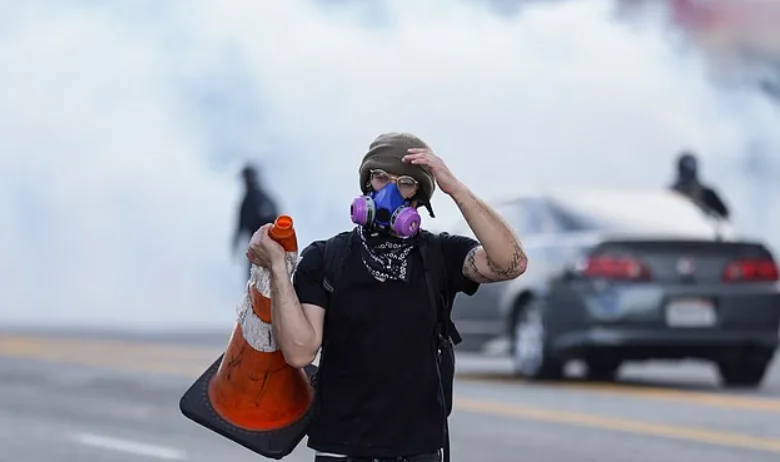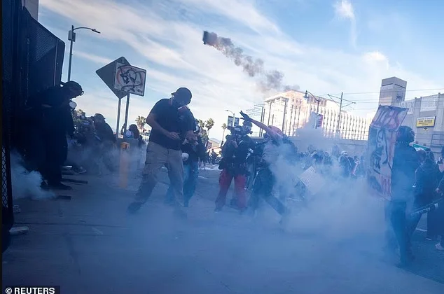 洛杉矶警察局宣布进入“战术警报”,现场连续发射催泪弹和烟雾弹。