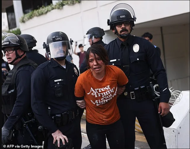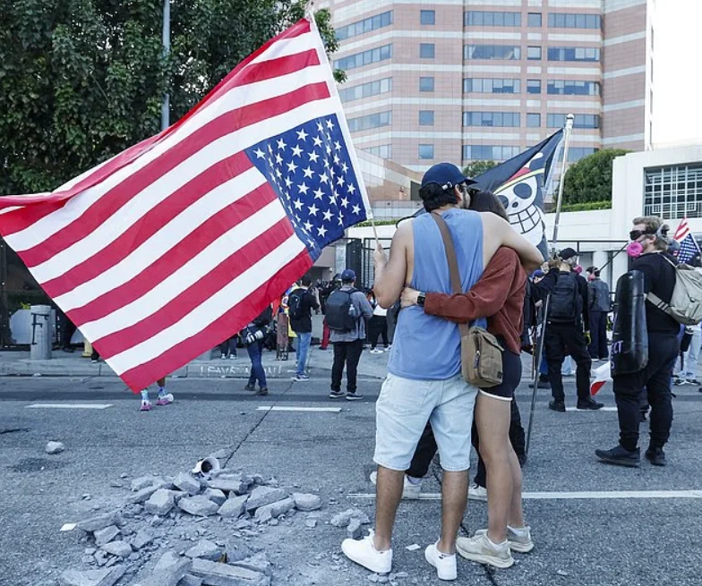 在洛杉矶,冲突集中爆发在Edward R Roybal Federal Building一带。现场视频显示,大量示威者将联邦大楼团团围住,有人不断向警察方向投掷石块、玻璃瓶,甚至直接搬起水泥块砸向执法人员,现场至少两名警员被击中后接受治疗。