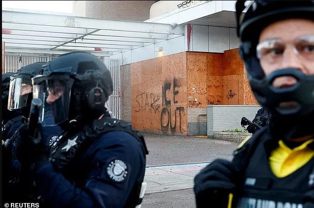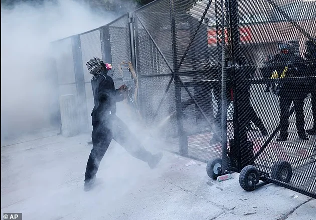 在波特兰,冲突进一步升级为肢体接触。多名戴面罩的示威者冲向联邦执法人员,将其扑倒在地,双方在U.S. Immigration and Customs Enforcement设施外发生推搡和扭打。现场画面显示,有人用喷漆在建筑外墙写下“纳粹”等字样。