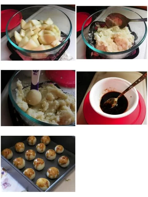 三、用手或用1/2汤匙的量勺整成球形,不太圆也没关系,自己家吃的,用量勺做比较能平均每个球的量,也整形状圆些,放在喷了油的烤盘上,如果你喜欢底铺锡纸也可以,不过烤土豆球底盘不会太粘,用胶铲稍推几下便可;