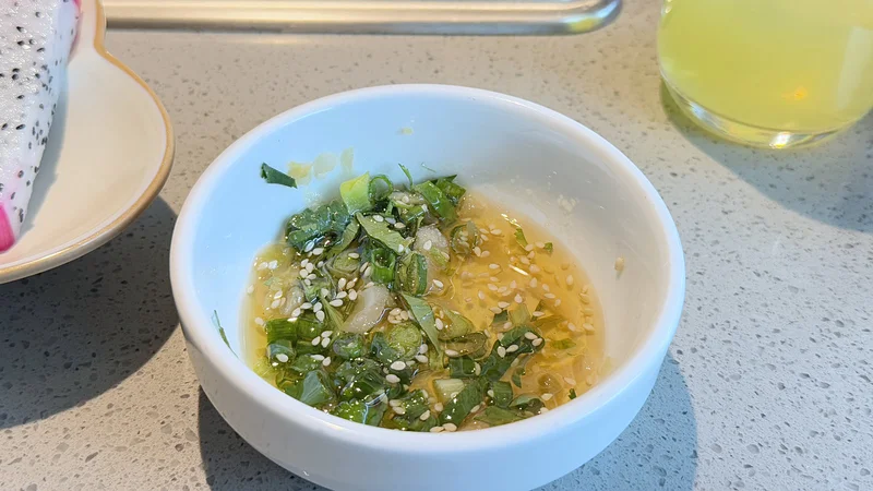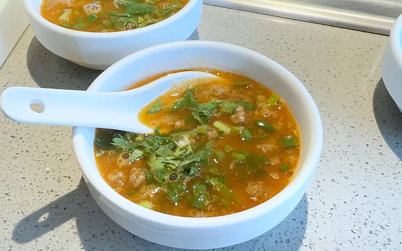 舀上番茄汤入碗,倒入配料,一碗牛肉番茄汤搞掂。