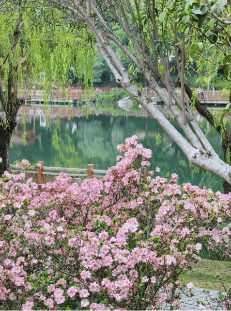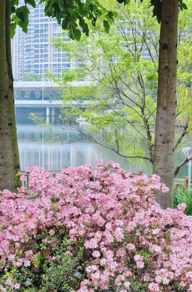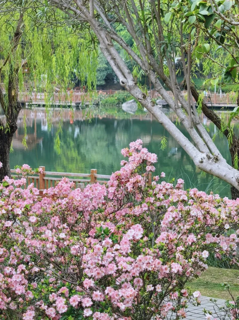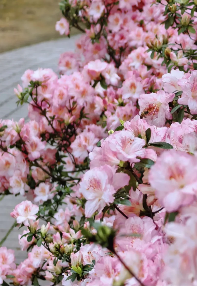 琴亭湖公园的粉色杜鹃开爆了