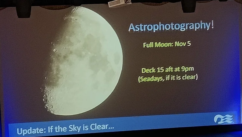 11月5日晚上9点之后到15层后甲板,可看满月(Full Moon)- 如果老天照应的话。运气不好,乌云的话,只好酒吧借酒浇愁,或者到游轮的赌场(Casino)捐钱去,然后回去洗洗睡了吧。