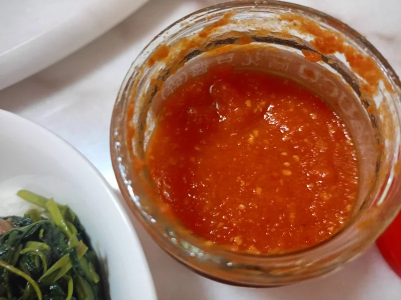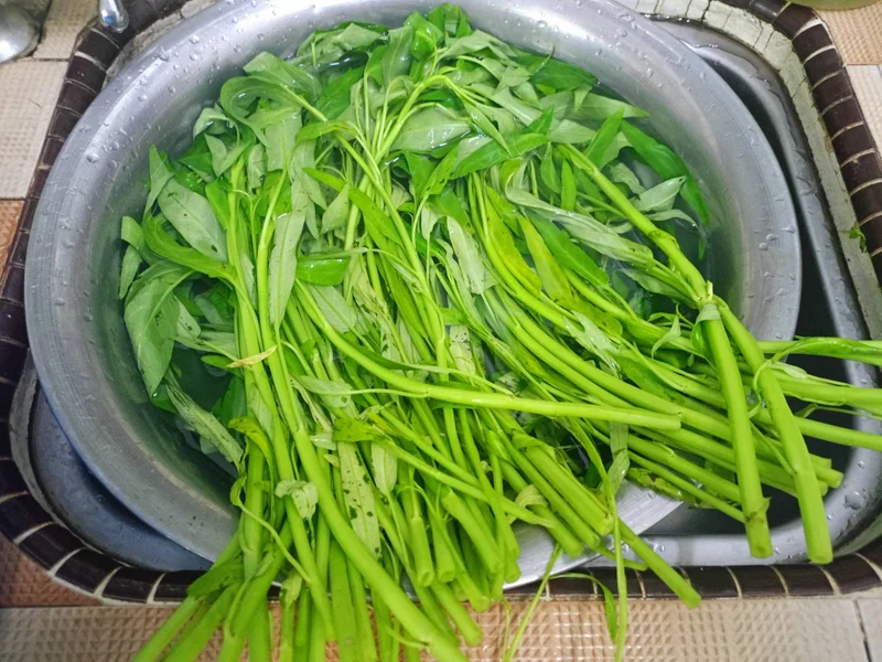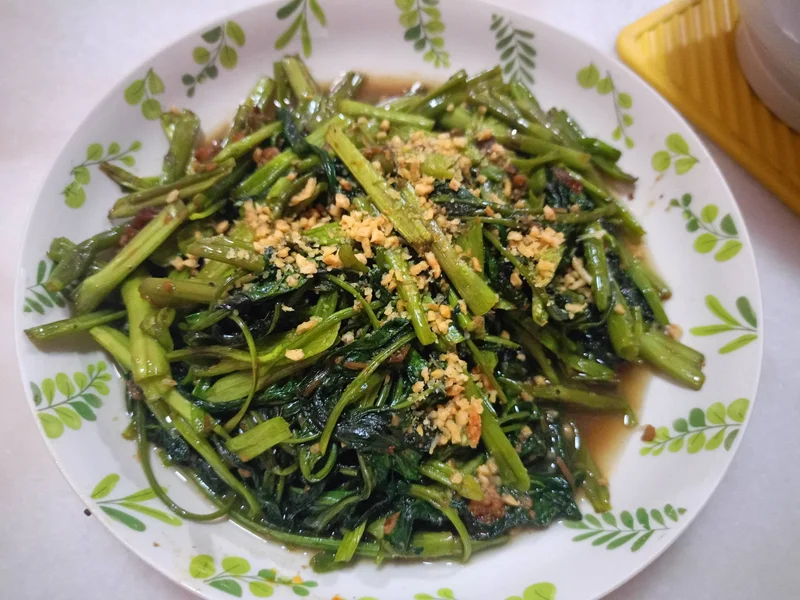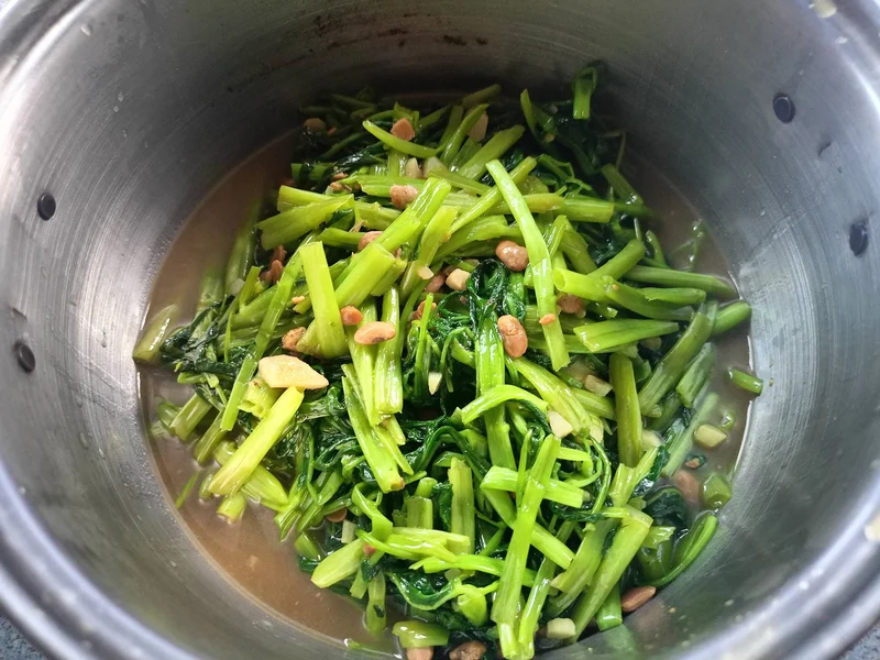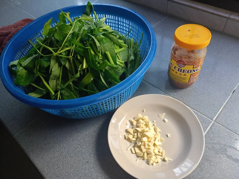 这次我炒空心菜,用最简单的料:蒜末和豆酱。