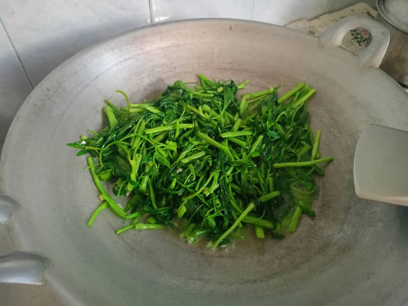 对了!早上未买空心菜前,太太有告诉我,吃两餐至少要买800克,我买了两绑,共 1.2 kg,午餐我只用了一绑比较多的来炒,太太说好像不够吃,我赶紧说:不怕,还有一绑没炒。