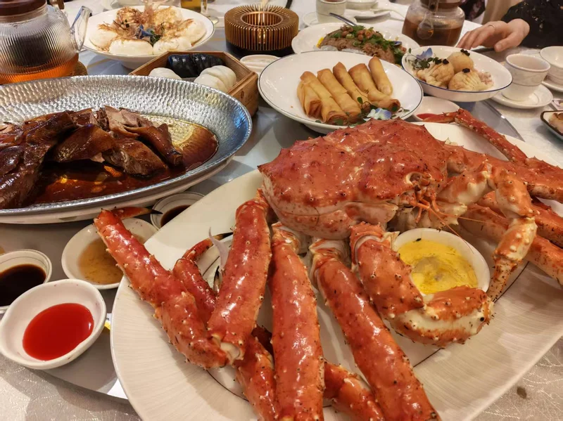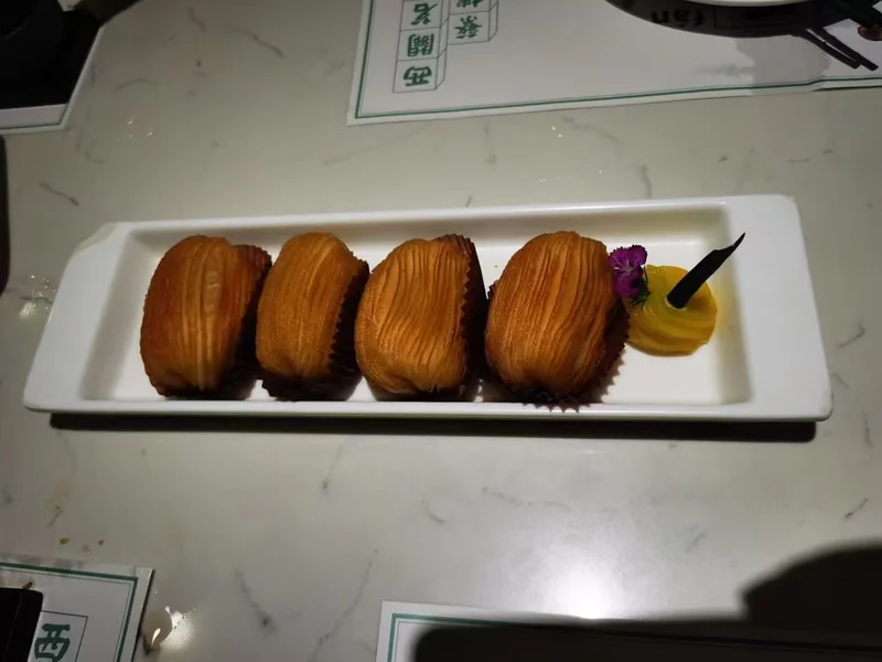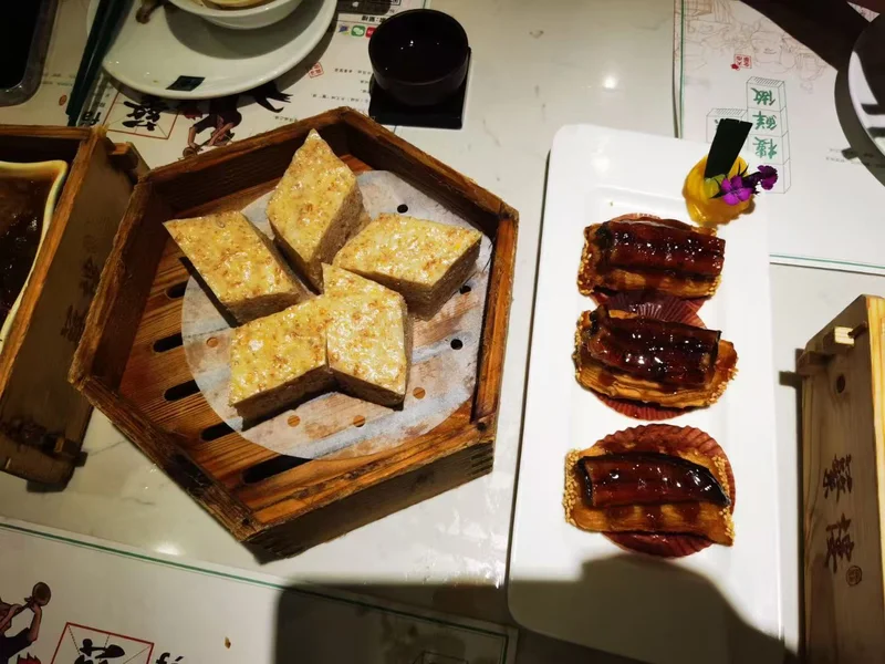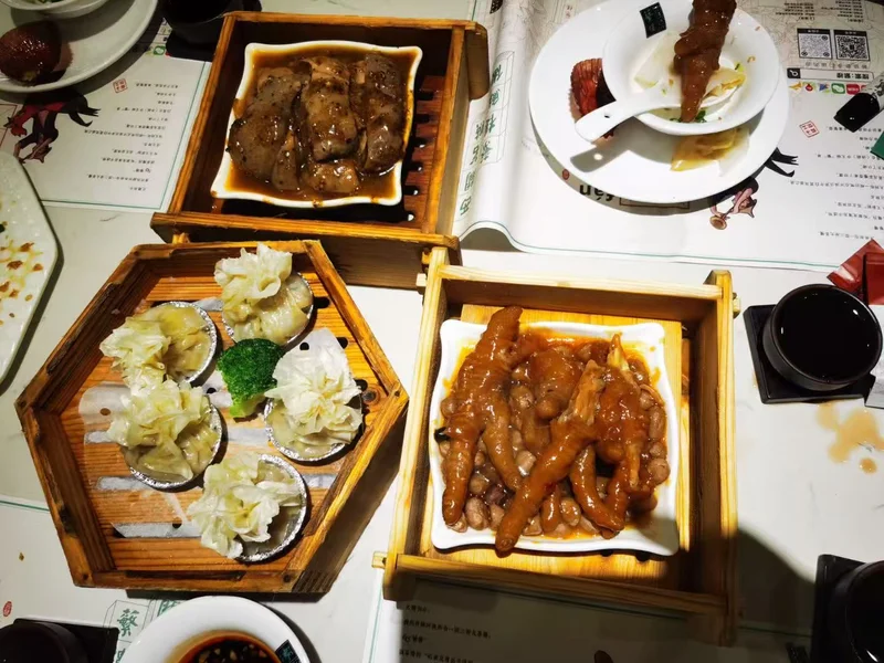 香脆明虾红米肠软糯红米外皮裹酥脆油条与整只鲜虾,配三种蘸酱,口感层次丰富。 XO酱山椒蒸凤爪,凤爪软烂脱骨,酱香带微辣,是每桌高频必点。