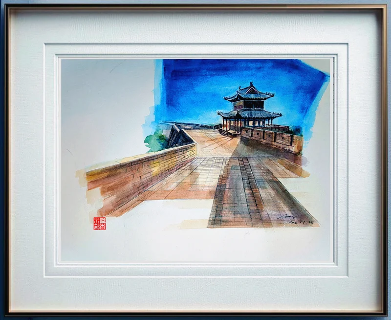 附记:画这幅画时,我曾试图为这座敌楼寻一个确切的名子。从杜鹃和花姐的提示,找到了山西代州那座城中的“边靖楼”和“威远楼”。然而它们都是孤立地立于城中,旁边被开发成城。另外,最让我放弃这两楼的是,它们的屋顶均不是重檐歇山顶,而照片中是重檐歇山顶。所以比对,互动,求证,我发现照片中的它只是代县城墙上无数平凡守望者中的一座,规制是典型的重檐歇山顶的敌楼。虽为小插曲,却趣味无穷。